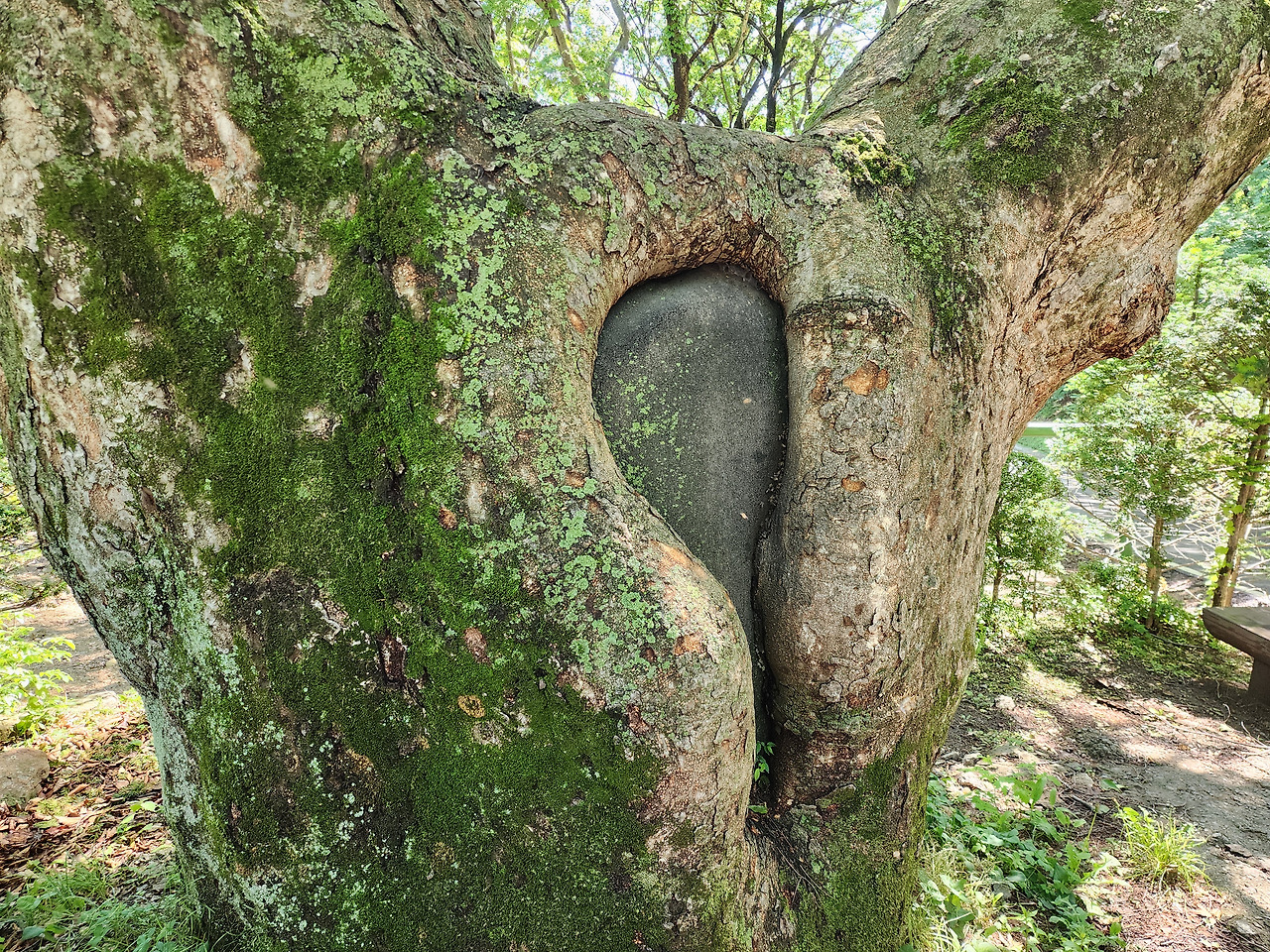아직 수령이 100년이 채 되지 않았음에도, 둘레는 성인 다섯이 팔을 벌려야 닿을 만큼 거대합니다.