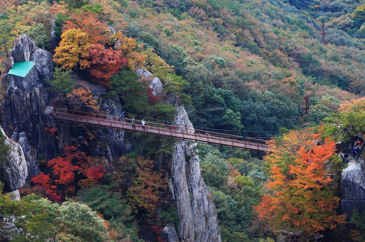 대둔산의 상징적인 장소로, 바위 협곡 위에 설치된 현수교입니다. 다리 위에서 아래를 내려다보면 절벽 사이로 붉은 단풍이 구름처럼 펼쳐진 모습이 장관을 이룹니다. 이곳은 단풍철 포토존으로 손꼽히며, 오전 햇살이 비칠 때 붉은빛이 가장 선명하게 보입니다.