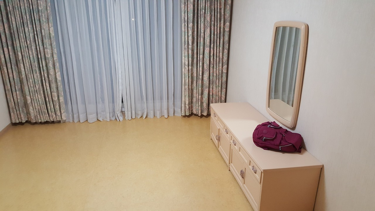 28평형 구조 특성상 방은 하나이며 온돌형입니다. 침구류는 4인 기준으로 제공되었고, 두께나 쿠션감이 호텔급은 아니지만 청결 상태는 양호했습니다. 일부 후기에서 침구에 대한 불만을 언급한 경우도 있었으나, 개인적으로는 숙면에 지장이 없었습니다. 방 옆 작은 수납 공간에는 선풍기, 청소기, 빨래 건조대가 정리되어 있어 장기 숙박 시에도 실용적으로 활용할 수 있었습니다.