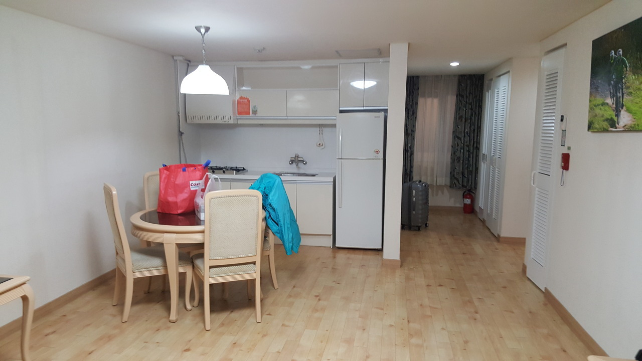 거실에는 TV와 기본적인 채널 가이드가 제공되어 휴식 공간으로 무리가 없었고, 공간 자체도 답답하지 않았습니다. 주방은 거실과 자연스럽게 이어지는 구조로, 4인용 식탁과 냉장고, 전자레인지, 밥솥이 기본으로 갖춰져 있었습니다. 밥솥의 내솥 상태는 다소 아쉬웠으나, 간단한 조리나 즉석식품 활용에는 큰 불편이 없었습니다.