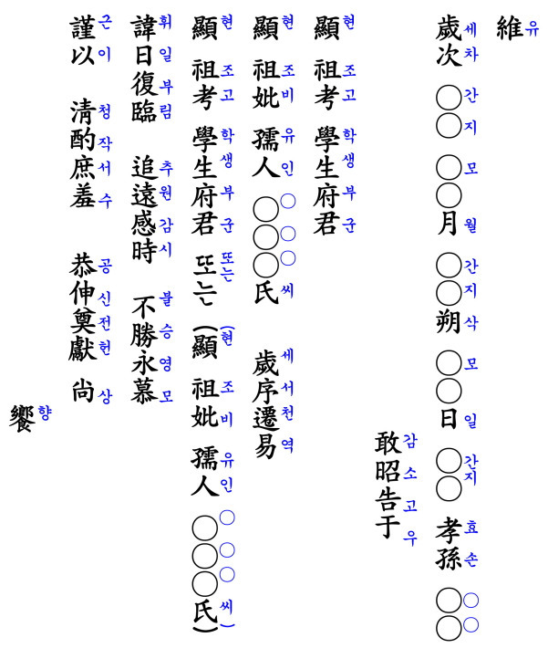 “維歲次 ○○年 ○月 ○日 子孫 ○○ 謹以 淸酌庶羞 祭于 顯考府君 顯妣孺人之靈 曰 父母之恩 深且重 子孫不忘 今以 至誠致祭 尙饗.”