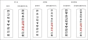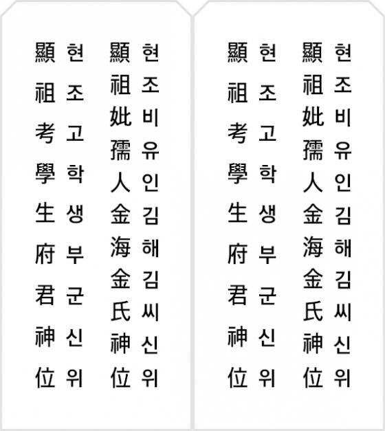 예: 顯妣孺人金海金氏神位 (김해김씨 어머니의 경우)