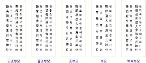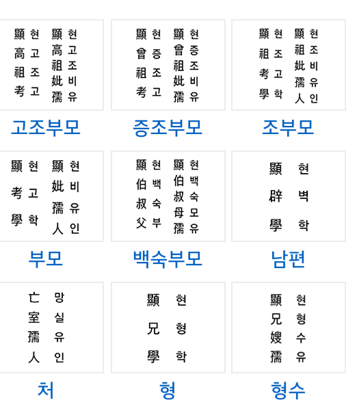 - 오른쪽부터 첫째 줄: 顯考 또는 顯妣