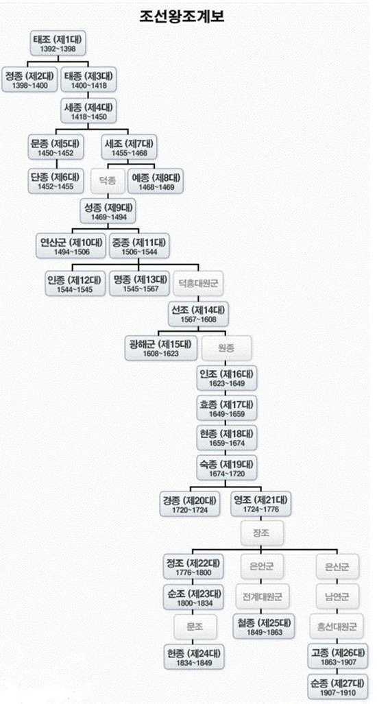 조선시대 왕의 본명(휘)과 재위기간, 업적, 그리고 조선왕조 가계도를 정리하면 조선의 정치·문화 변천사를 조선왕조 계보를 통해 한눈에 이해할 수 있다.