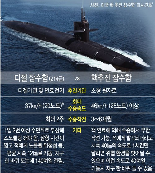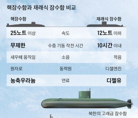 핵추진 잠수함은 핵반응로를 탑재해 물을 가열하고 그 증기로 터빈을 돌려 추진력을 얻는 방식으로 운용됩니다. 기존 디젤 잠수함은 산소가 공급되는 수면 부근에서 연료를 공급받거나 배터리를 재충전해야 하는 반면, 핵추진 잠수함은 압력이 유지된 물속에서도 장기간 잠항이 가능하고 고속 항해가 가능하다는 기술적 이점이 있습니다.