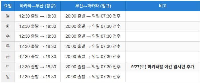 | 요일 | 하카타→부산 (정규) | 부산→하카타 (정규) | 비고 |